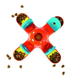 The Dog Tornado puzzle toy is a colorful toy that spins around to reveal treats in several different spots. Dogs can spin it around with their nose or paws, and you can also set the white plastic bones in the holes over the treats to make it more challenging for your dog.