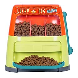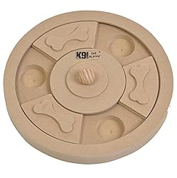 This colorful SunGrow puzzle toy has a variety of different sliders to push around and reveal treats. It has four smaller sliding discs with eight small treat compartments at the top, and one larger clock style section in the middle. This toy is great for puppies and adult dogs alike, and you can make the game a bit easier or harder by hiding more or less treats inside.